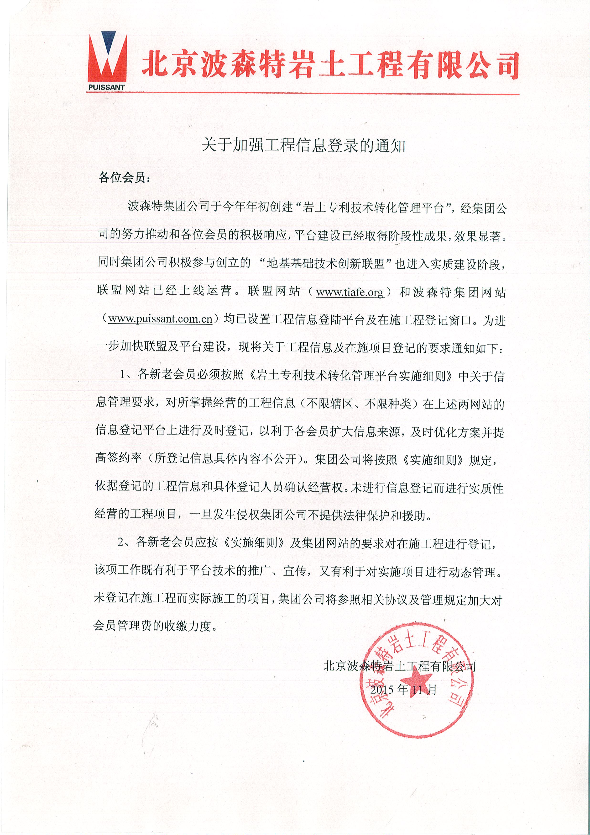 1、各新老會員必須按照《巖土專利技術轉化管理平臺實施細則》中關于信息管理要求,對所掌握經(jīng)營的工程信息(不限轄區(qū)、不限種類)在上述兩網(wǎng)站的信息登記平臺上進行及時登記,以利于各會員擴大信息來源,及時優(yōu)化方案并提高簽約率(所登記信息具體內(nèi)容不公開)。集團公司將按照《實施細則》規(guī)定,依據(jù)登記的工程信息和具體登記人員確認經(jīng)營權。未進行信息登記而進行實質性經(jīng)營的工程項目,一旦發(fā)生侵權集團公司不提供法律保護和援助。
